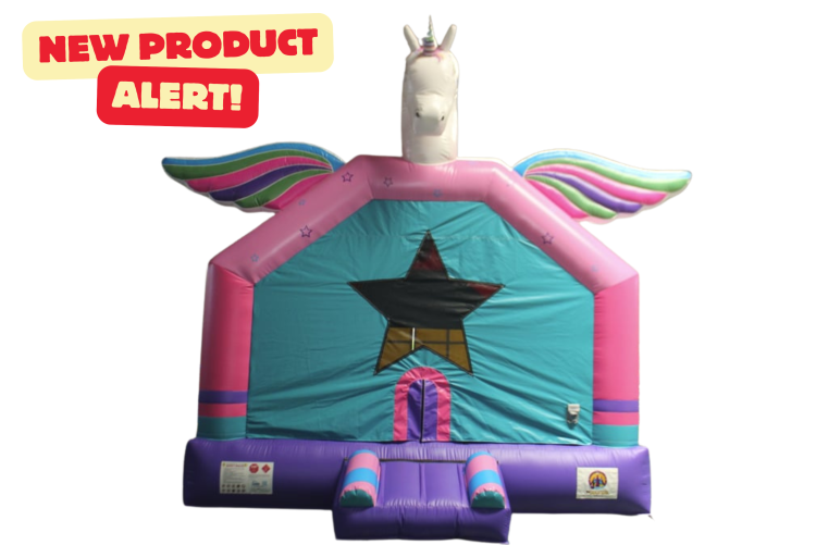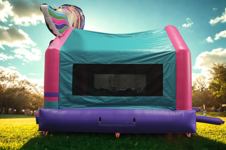 A bright and whimsical inflatable bounce house shaped to delight kids with a unicorn theme. It features cheerful colors and a roomy jumping area where children can safely bounce and play under soft, rounded walls that help keep activity contained. Simple to set up and perfect for birthday parties, family gatherings, or any event that could use a touch of magic, this unicorn bounce house creates a fun, energetic play space that sparks imagination while providing hours of active entertainment.